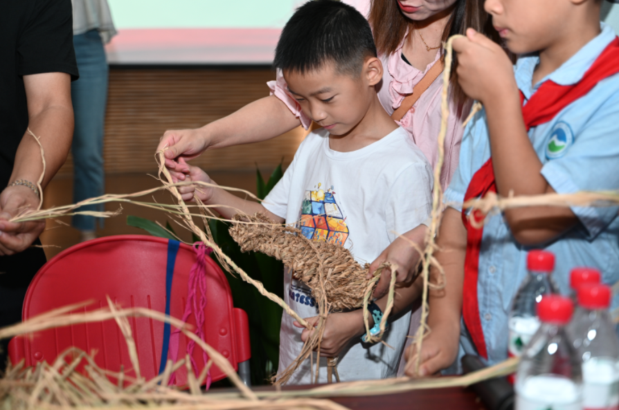 参观结束,阵地转移到活动室。孩子们先是观看了“长征”主题的微电影,跟随影片重温了那段艰苦的行程,在潜移默化中接受红军精神的教育。随后,又通过观摩和体验编制草鞋——这一特殊的历史符号,进一步了解和体会到当年红军艰苦跋涉、浴血奋战的不易。孩子们一个个充满好奇,目不转睛地观察了手工老师用简单的材料搓出草绳,再编制成草鞋的全过程。下一个环节,孩子们在手工老师的示范下,在爸爸妈妈的协助下,将“长征”路线图、红色圣地——井冈山、天安门城楼等制作成竹编画,感受传统竹编与红色文化相融合的独特魅力。