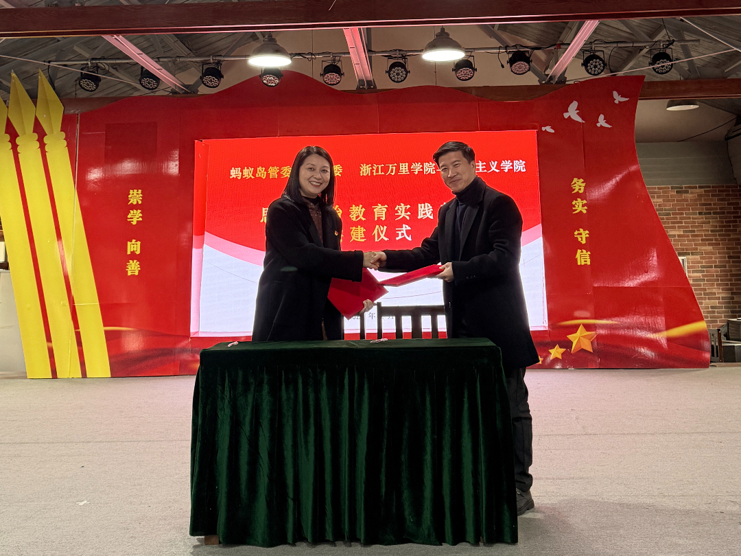 2026年2月4日,蚂蚁岛精神红色教育基地与浙江万里学院马克思主义学院正式签约共建思想政治教育实践基地,标志着双方以红色基因为纽带、以思政育人为核心的校地深度合作正式开启。