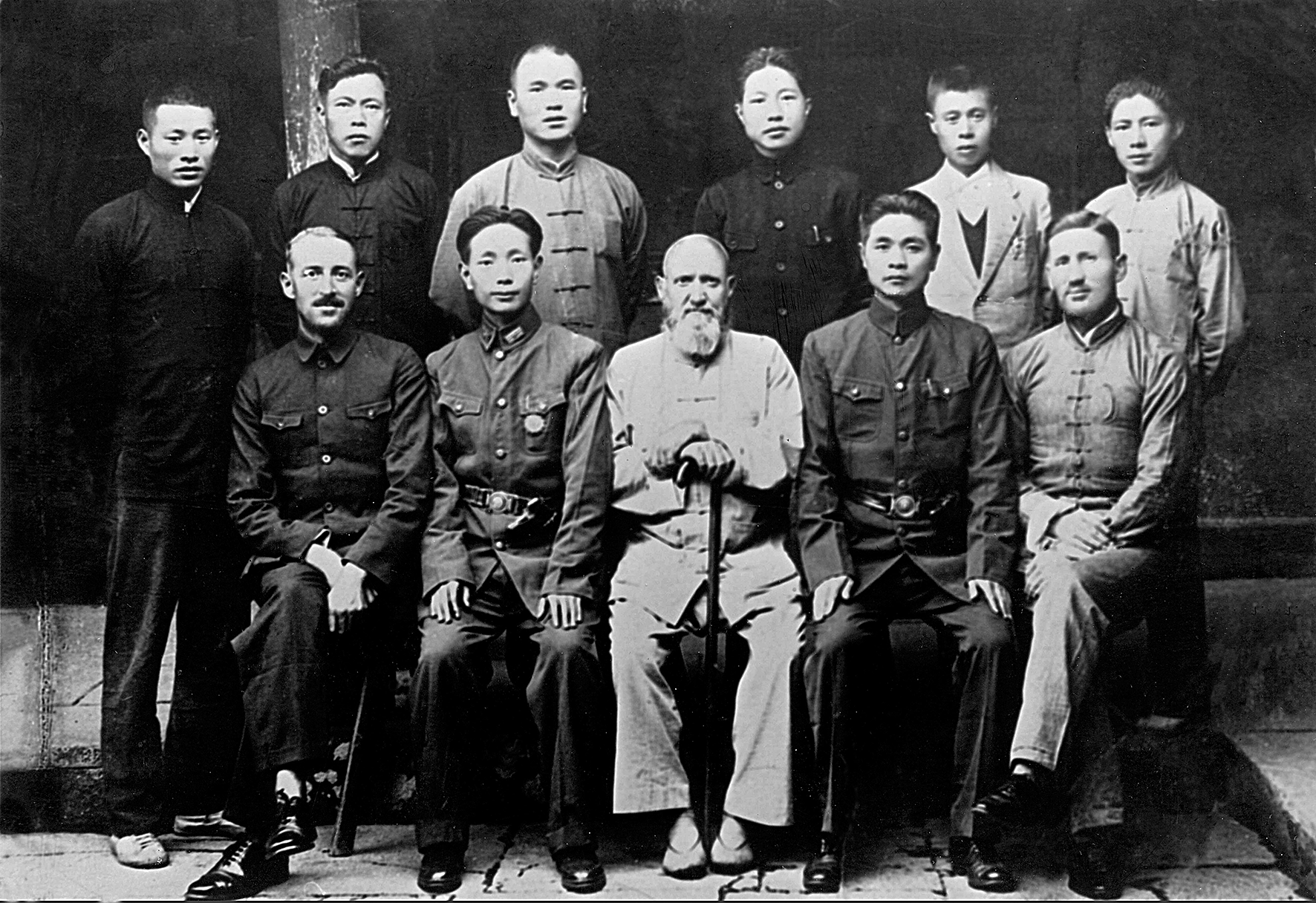 1942年10月上旬,(前排左起)伊文思、缪凯运、詹姆斯、王继能、法伦斯与护送人员在宁波合影